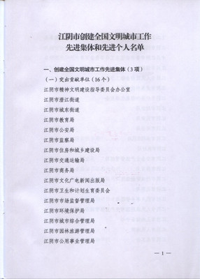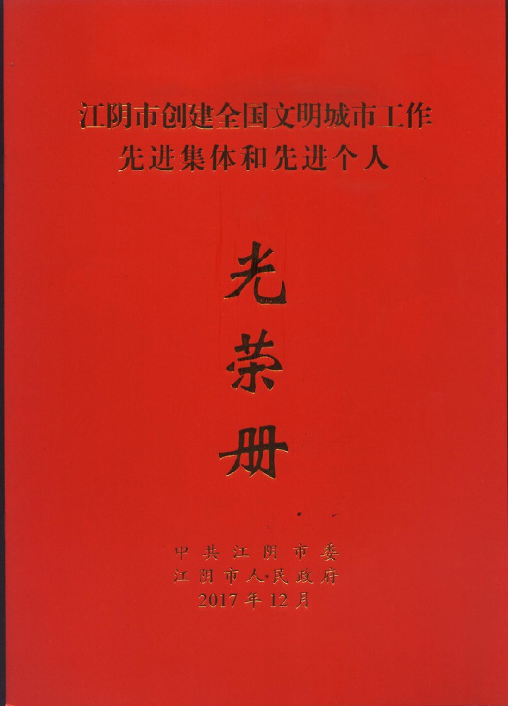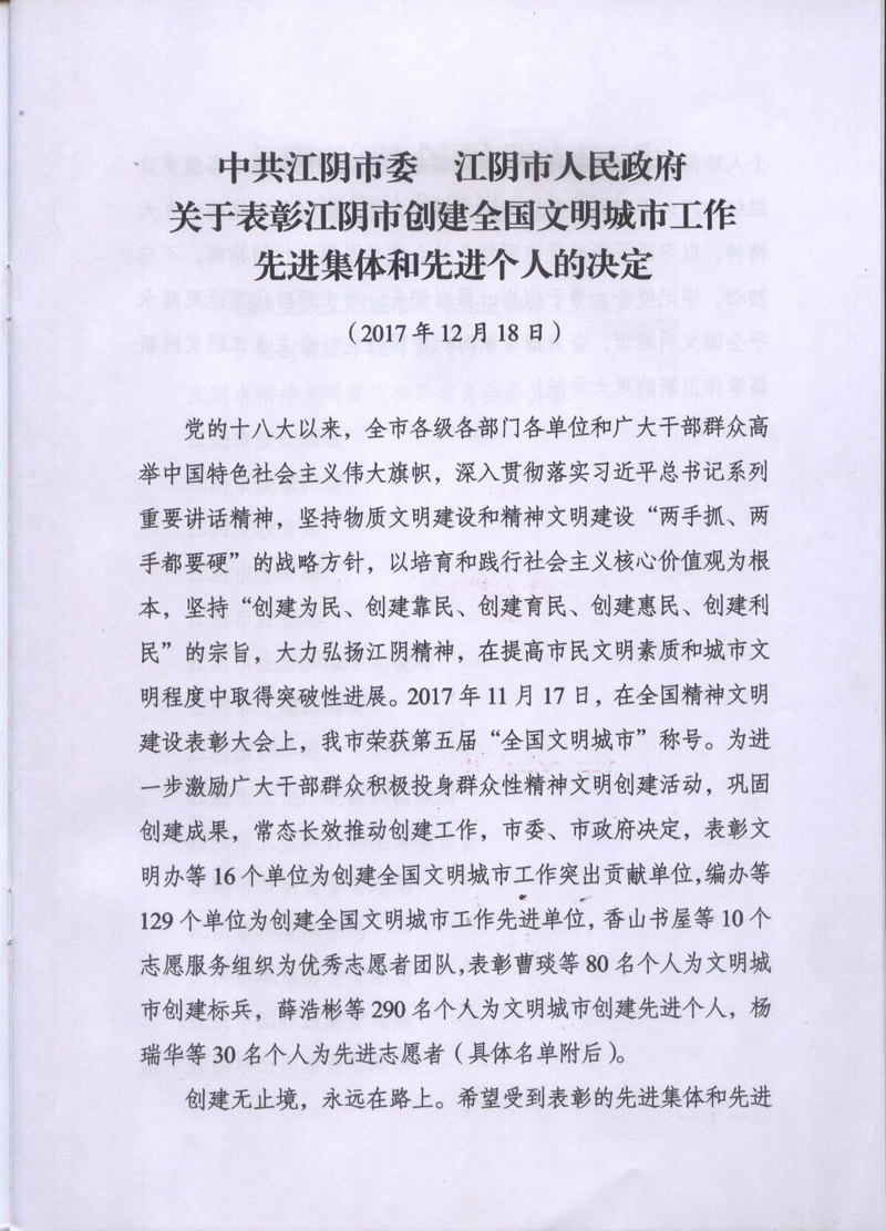 三亿注册线上平台被评为17年江阴创建文明城市工作先进集体